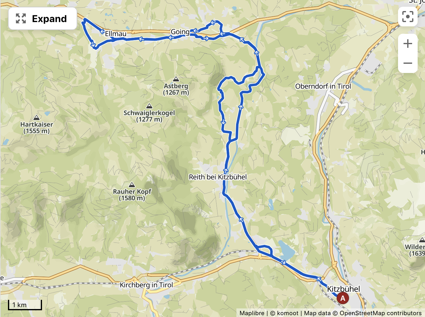 After the underpass at Stanglwirt, we’ll cruise through Prama and Going with the Wilder Kaiser rising ahead. The return leg adds some vertical metres via the lower Astberg Plateau—just enough to get the heart rate (and dopamine) up before rolling back into Kitzbühel.